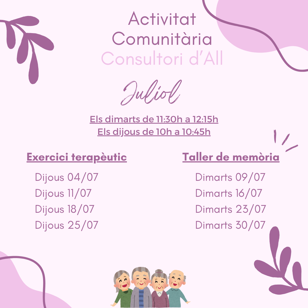 Actualitat, Agenda ACTIVITATS DEL CONSULTORI PER JULIOL Del 1 al 31 de juliol de 2024 | Sala de Plens de l'Ajuntament d'Isòvol < Entrada AnteriorEntrada Posterior >