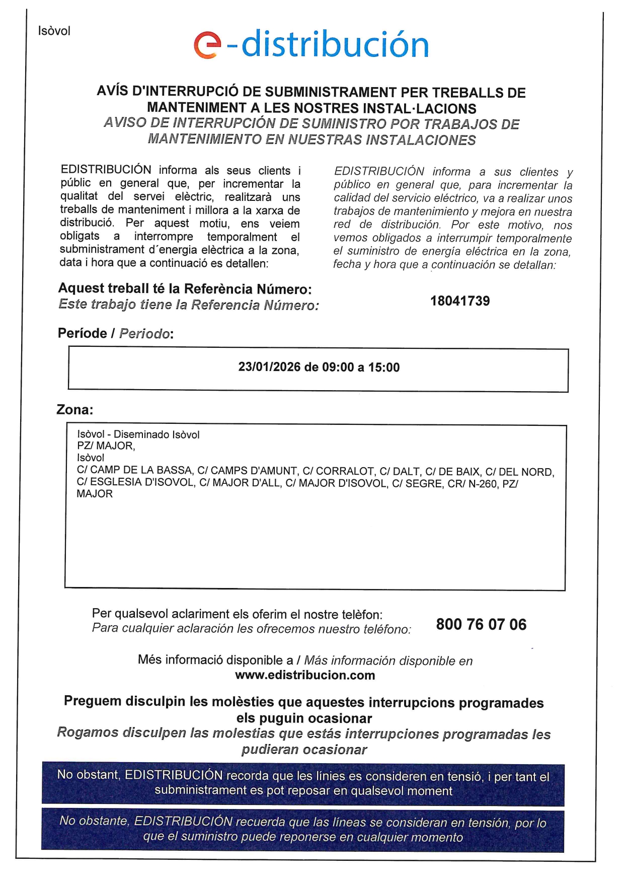 • AVÍS D’INTERRUPCIÓ DE SUBMINISTRAMENT ELECTRIC PER TREBALLS DE MANTENIMENT