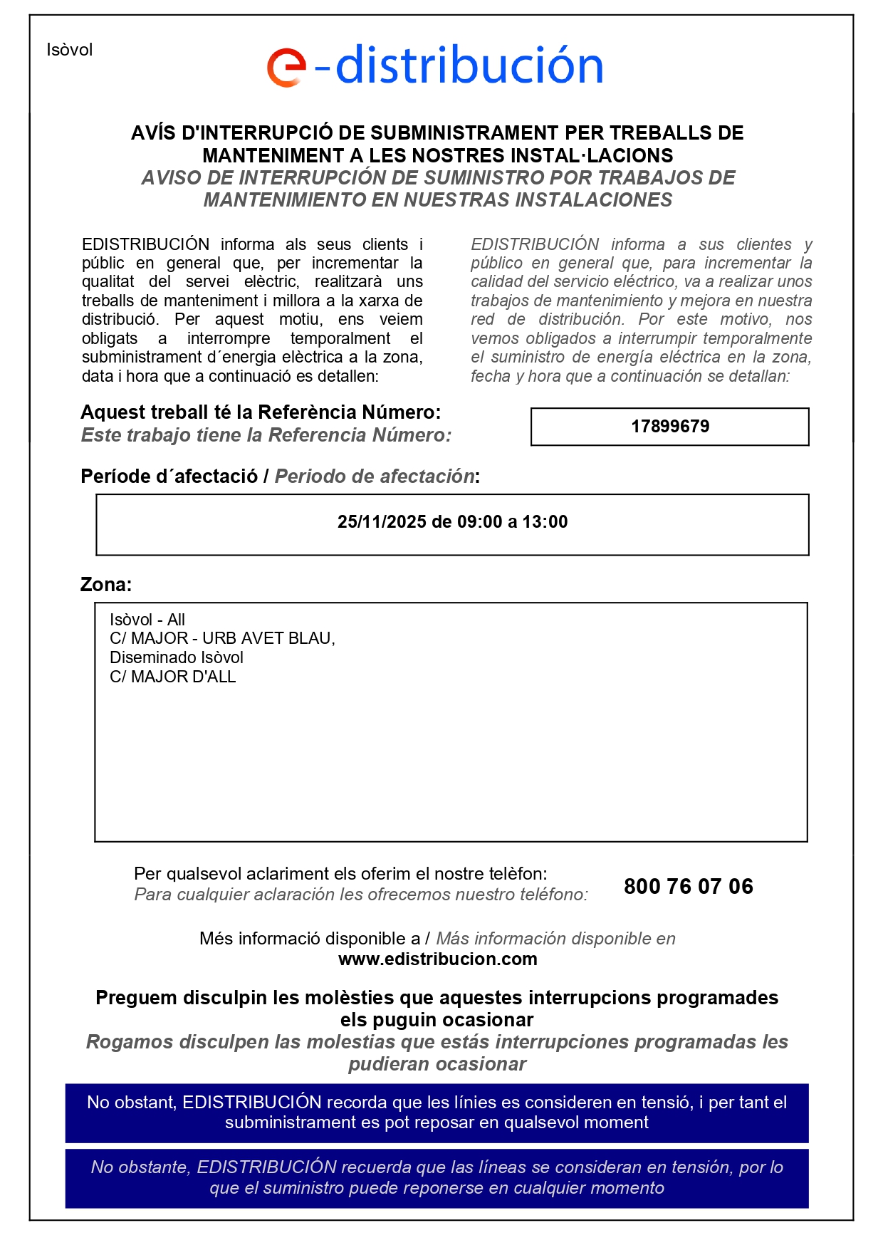 Actualitat, Agenda AVÍS D’INTERRUPCIÓ DEL SUBMINISTRAMENT ELÈCTRIC PER TREBALLS DE MANTENIMENT Dimarts, 25 de novembre 2025 de 9.00 a 13.00h | Isòvol i All < Entrada AnteriorEntrada Posterior >