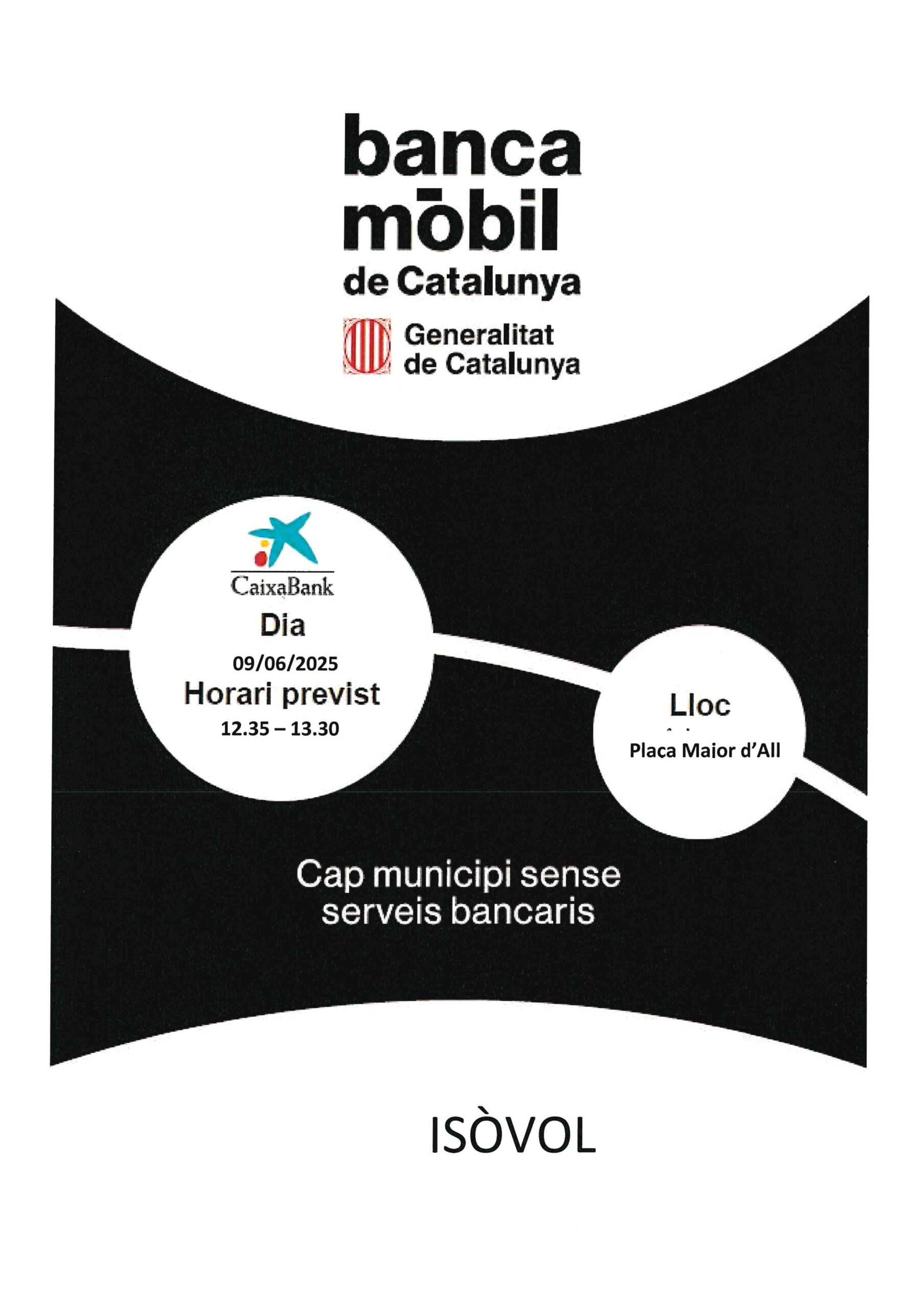 La banca mòbil és un servei de la Generalitat de Catalunya que porta els caixers automàtics i els serveis financers als municipis que no disposen d’oficina bancària. El servei es presta un cop al mes.