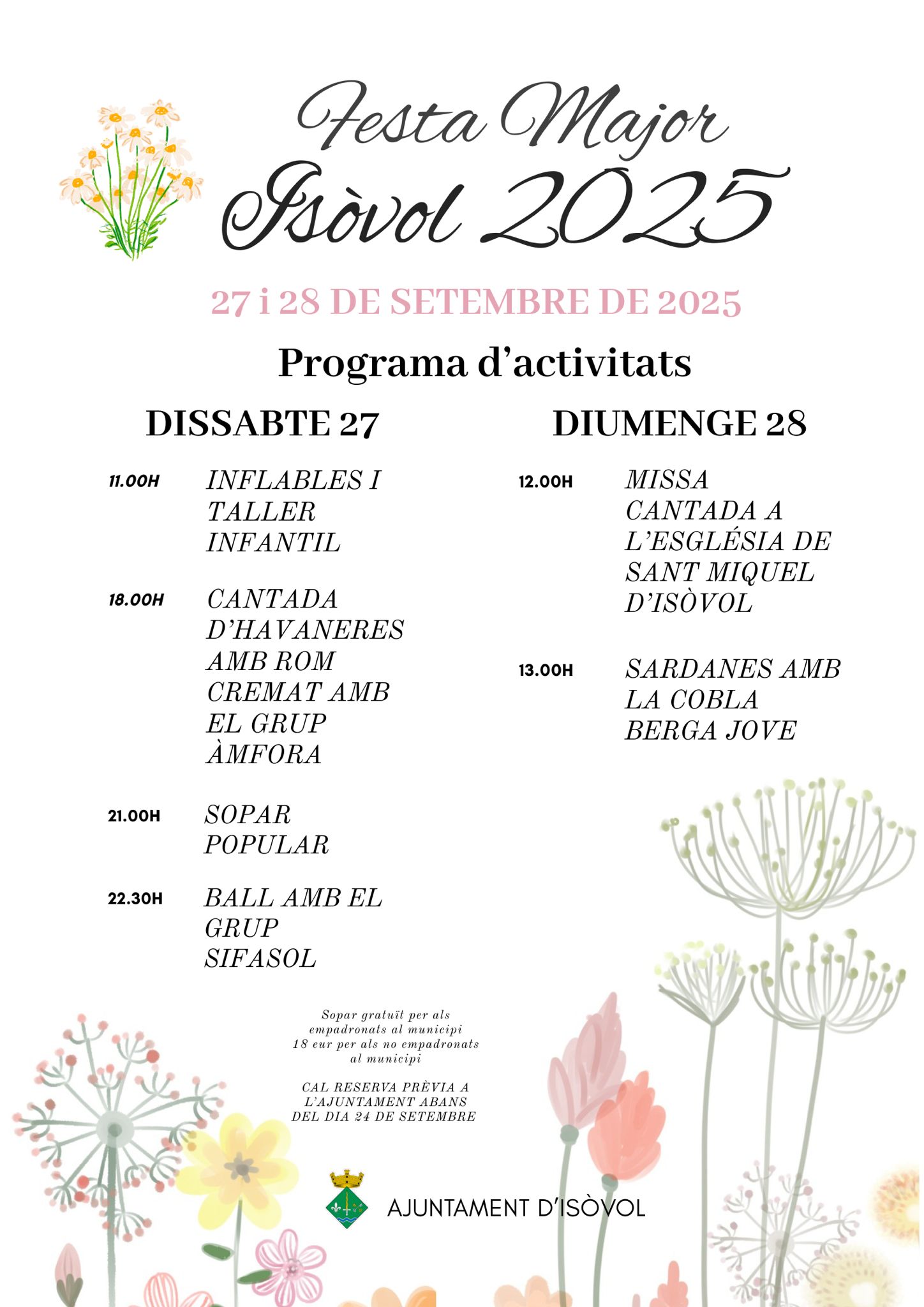 Actualitat, Agenda FESTA MAJOR D´ISÒVOL 2025 27 i 28 de setembre de 2025 Programa d´activitats 20/08/2025 - 29/09/2025 < Entrada AnteriorEntrada Posterior >