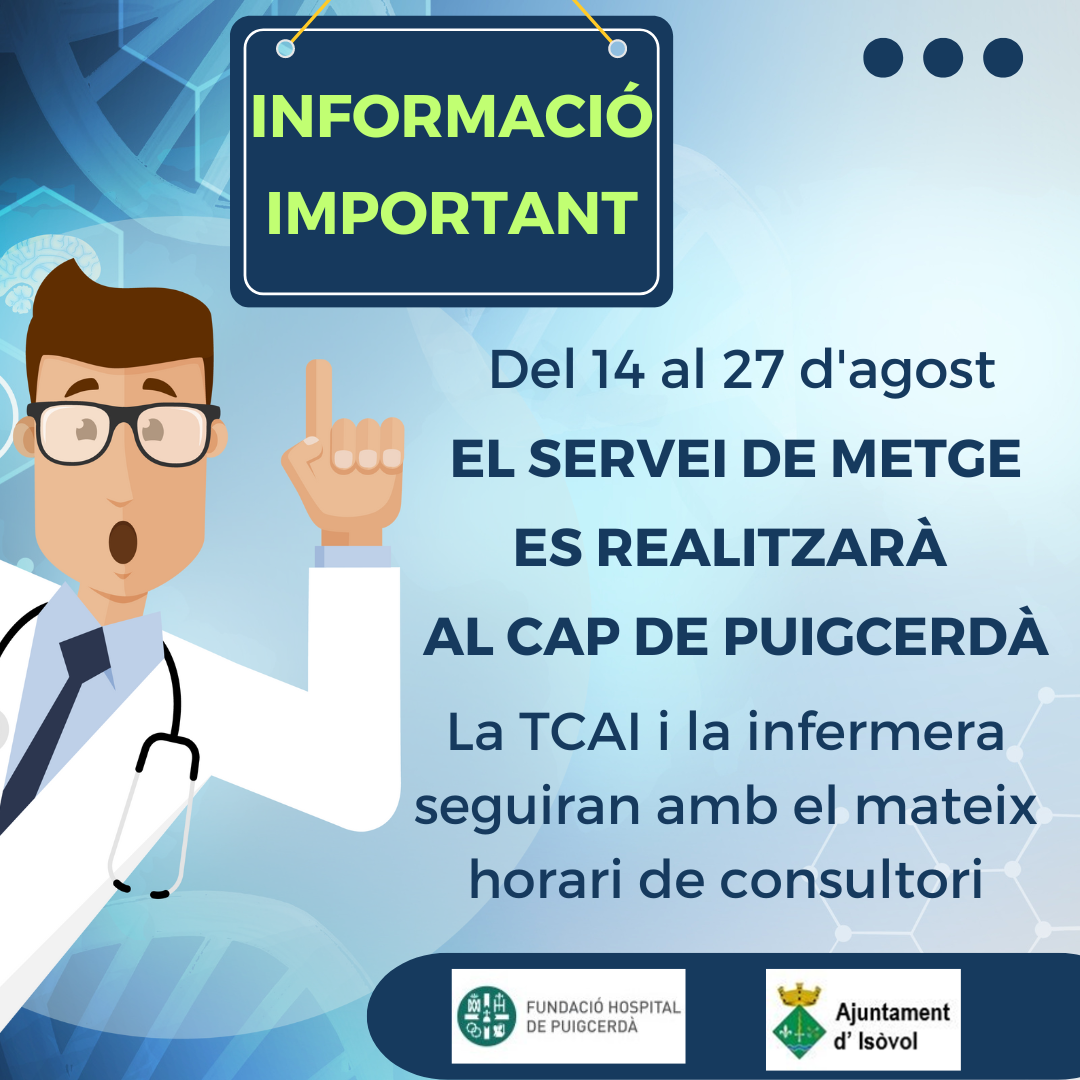 També us informem que del 14 al 27 d’agost,  les visites amb la metgessa es traslladen al CAP de Puigcerdà, però el servei amb la TCAI i la infermera seguiran amb el mateix horari al consultori d’All.