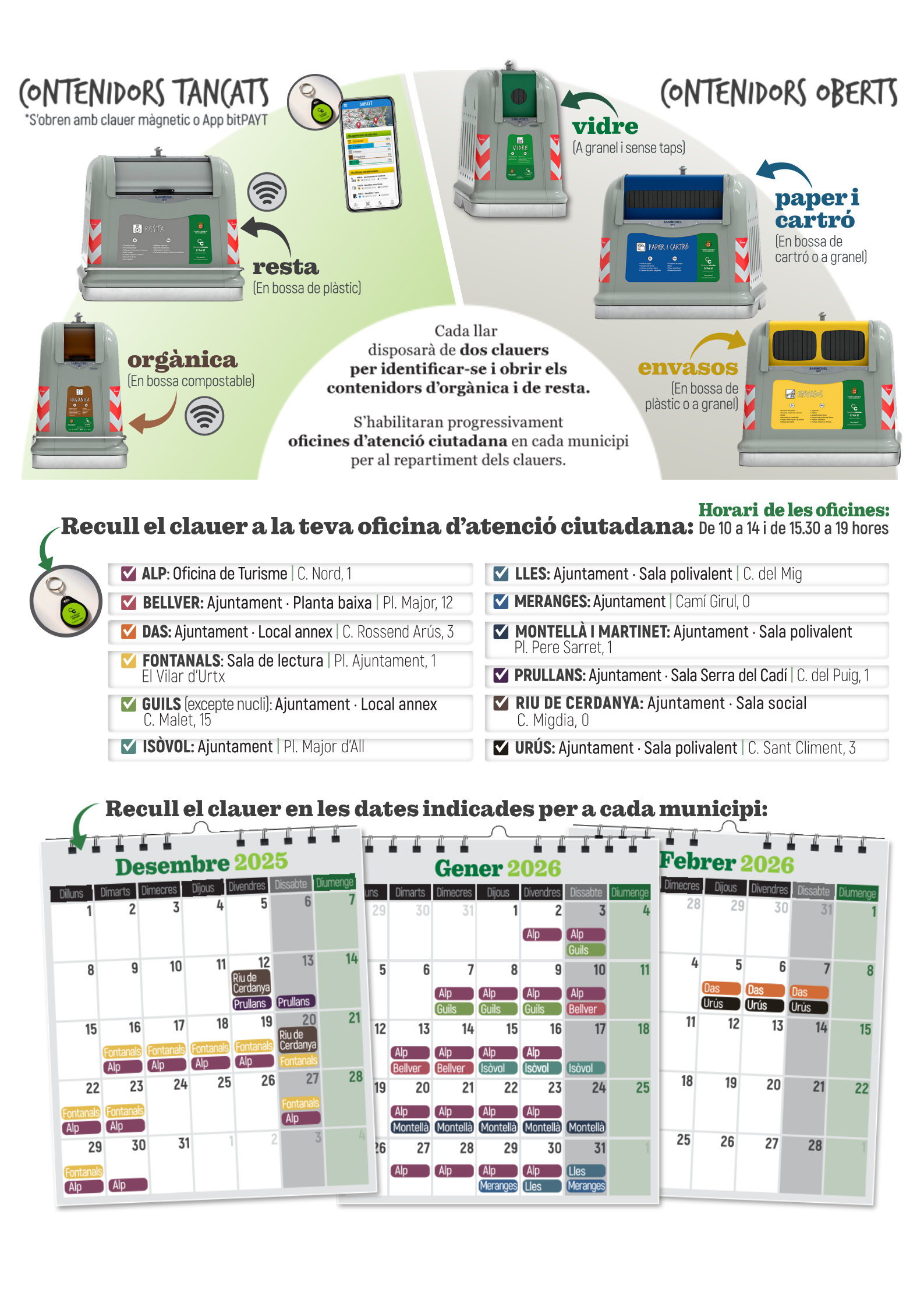 Els dies 15, 16 i 17 de gener, el personal del Consell Comarcal de la Cerdanya estará a la sala de plens de l’Ajuntament d’Isòvol per entregar els clauers per poder obrir aquests contenidors intel·ligents.