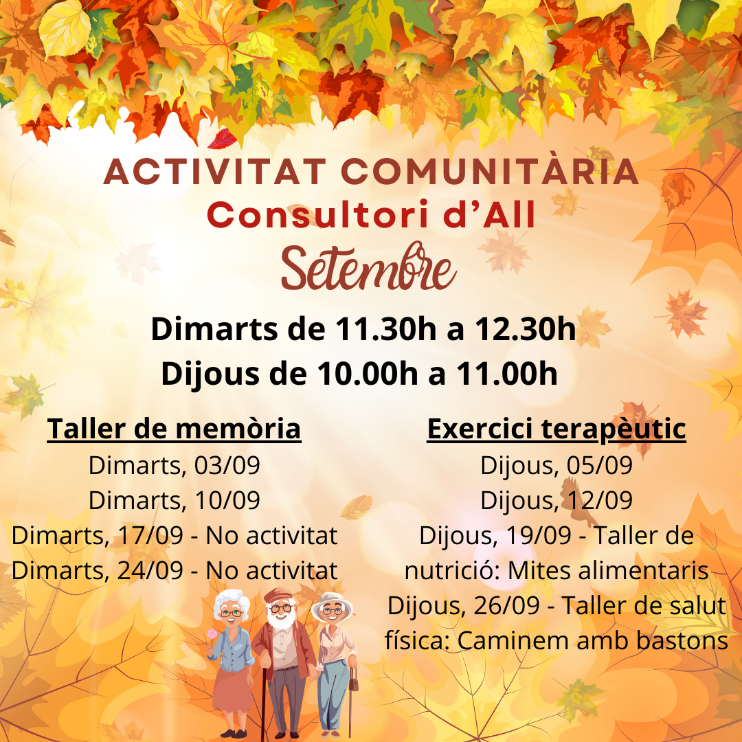 Actualitat, Agenda MODIFICACIÓ DE LES ACTIVITATS DEL CONSULTORI PER AQUEST SETEMBRE 2024 Tot el Setembre | Sala de Plens de l'Ajuntament d'Isòvol < Entrada AnteriorEntrada Posterior >