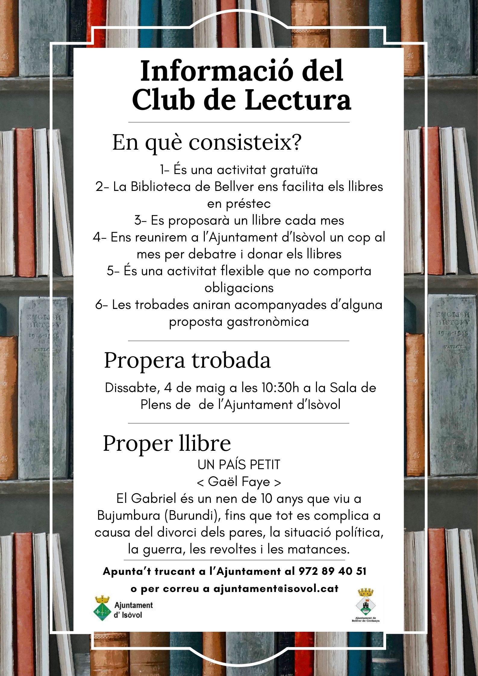 Agenda NOVA TROBADA DEL CLUB DE LECTURA Dissabte, 4 de maig a les 14.30h | Sala de Plens de l'Ajuntament d'Isòvol < Entrada AnteriorEntrada Posterior >