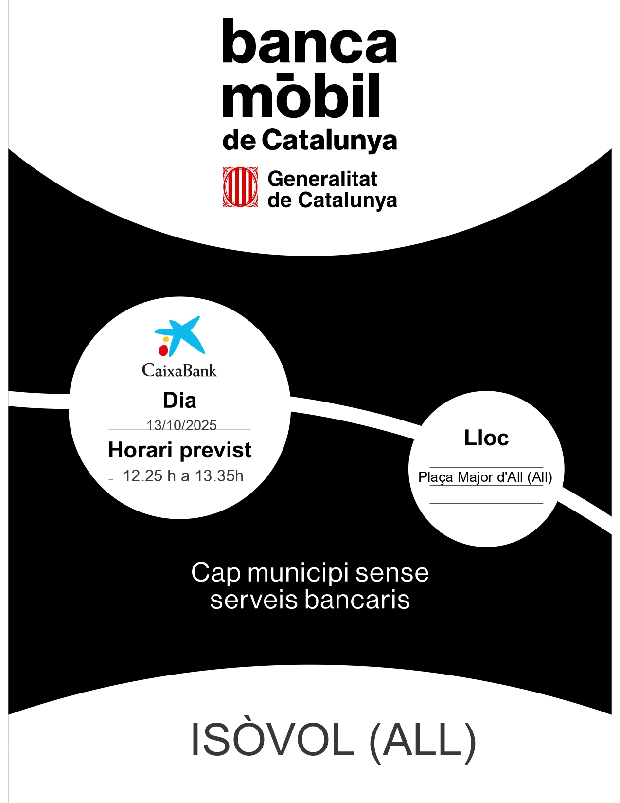 Actualitat, Agenda NOVA VISITA DE LA BANCA MÒBIL AL MUNICIPI Dilluns, 13 d'octubre de 2025 de 12.25h a 13.35h | Plaça Major d'All (davant de l'Ajuntament) < Entrada AnteriorEntrada Posterior >