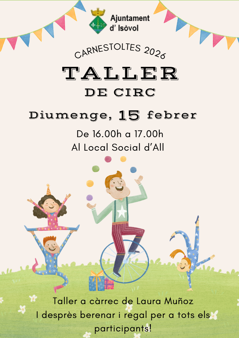 Actualitat, Agenda TALLER DE CIRC ~ CARNESTOLTES 2026 Diumenge, 15 de febrer de 2026. De 16.00h a 17.00h | Sala del Local Social d'All < Entrada AnteriorEntrada Posterior >