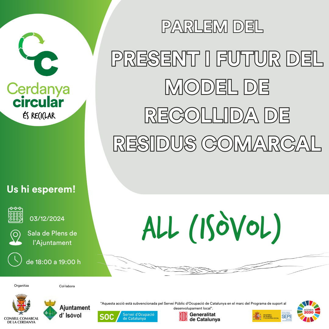 El Consell Comarcal de la Cerdanya convoca una reunió/xerrada informativa per a tots els veïns del municipi que hi vulguin assistir, per parlar del nou model de recollida de residus que s’implementarà properament a tota La Cerdanya.
